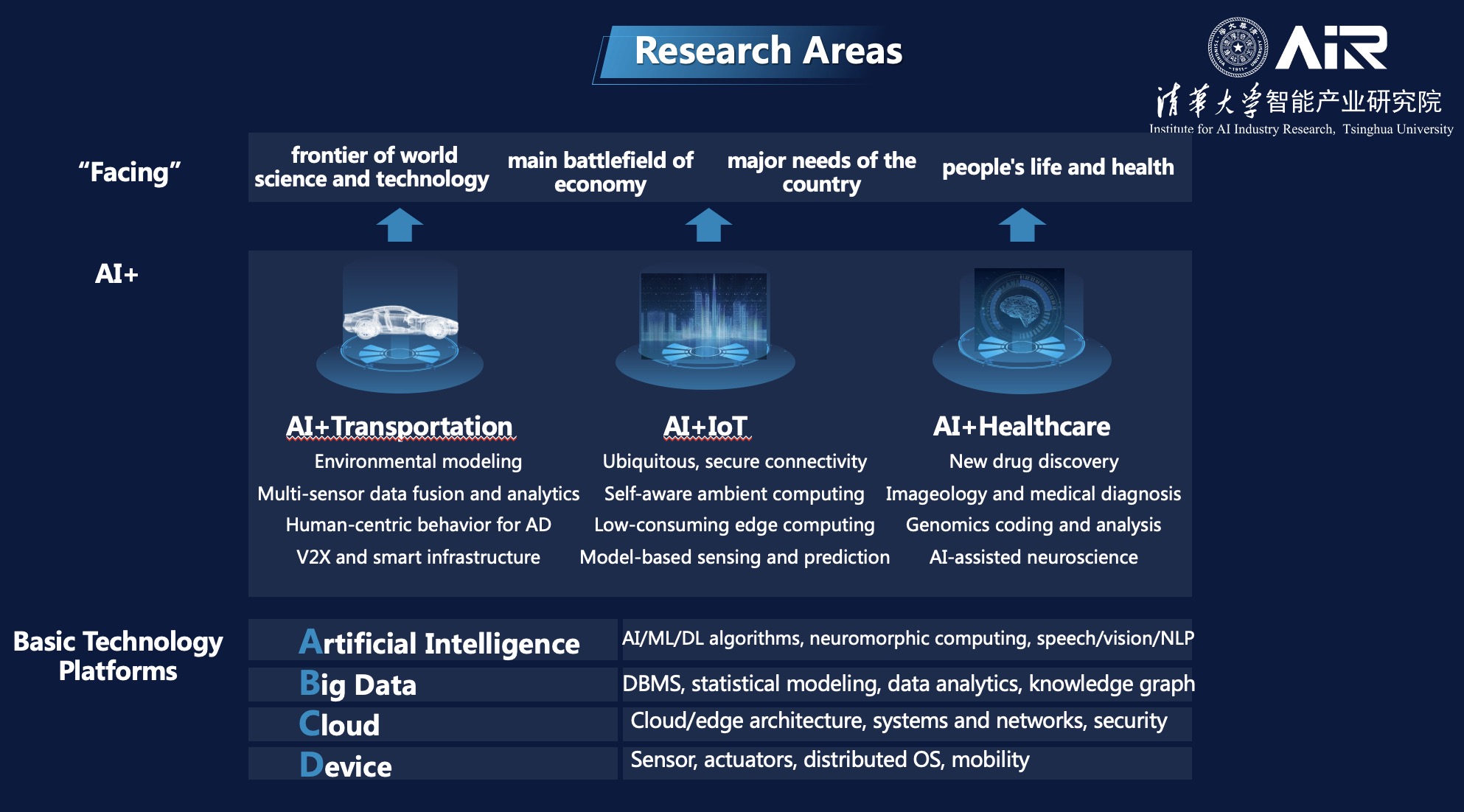 The Institute for AI Industry Research, Tsinghua University (AIR) insists on facing the frontier of world science and technology, the main battlefield of economy, the major needs of the country, and people's life and health. AIR gives full play to the strategic support role of science and technology innovation, actively explores in discipline construction and scientific research, highlights originality, common orientation and cross-fertilization, aiming to use AI technology to empower industrial upgrading and promote social progress. AIR supports innovation in the application of AI in the three major fields of transportation, healthcare and IOT, as well as breakthroughs in original technologies in the direction of big data and computational intelligence and intelligent robotics. Through the dual engines of university and enterprise innovation, AIR will break through the core AI technologies and promote the development of the AI industry.