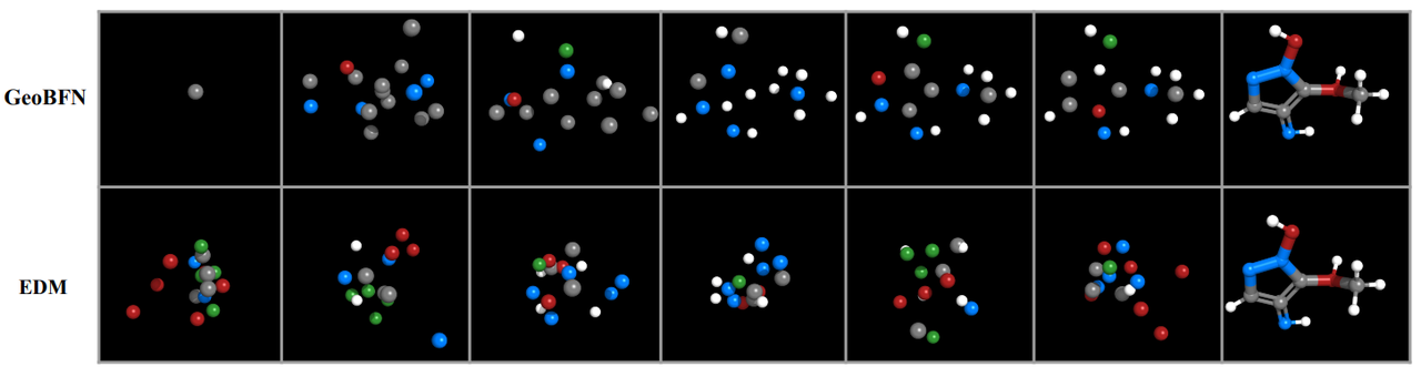 摘要在本文中,课题组提出了几何贝叶斯流网络(GeoBFN)以一种和扩散模型从根本上不同的方式建模3D分子结构。贝叶斯流网络(BFN)通过采用独特的方法,结合贝叶斯推断来修改一组独立分布的参数,为几何生成建模带来了全新的角度。首先,GeoBFN对于分子几何结构中的不同模态采用了统一的概率建模方式;其次,关于3D原子坐标的建模,相比于扩散模型,贝叶斯流网络的输入方差显著较低,从而在对分子结构噪音敏感性上有更好的兼容性。此外,通过等变的依赖关系模块将几何对称性引入贝叶斯更新过程中。本文进一步证明了GeoBFN在概率建模上的SE-(3)不变性以及迭代更新的生成方式具有旋转平移等齐性;第三,利用BFN强大的概率建模能力,3D分子几何表示可以进一步优化为仅具有两个更加接近的模态表示:离散整数的电荷和连续的原子坐标。针对原本BFN对于连续整数变量生成存在的模式冗余问题,本工作在GeoBFN提出了早期模态搜寻的策略进行解决。借助于在方差较小的空间中操作,GeoBFN可以以任意步数进行采样,从而提供效率和质量之间的最佳权衡,如在保持和之前方法质量一致的前提下实现了20倍的加速。此外,GeoBFN是一个通用框架,可以轻易地扩展到其他分子任务。 文中对GeoBFN在多个基准测试上进行了全面评估,包括无条件和有属性条件分子生成任务。结果显示GeoBFN在分子稳定性和其他指标上始终取得了目前最佳生成性能。实证研究也表明在可控生成方面有明显的改善,并表明GeoBFN具有显著更高的建模能力和推理效率。