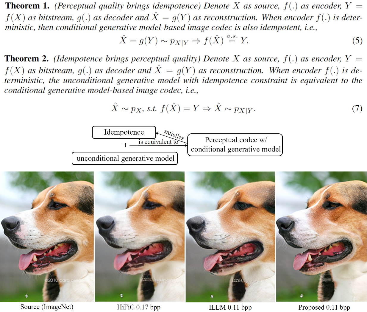 摘要         幂等性是图像编解码器对多次压缩的稳定性。初见时,幂等性与主观质量图像压缩无关。事实上,幂等图像压缩与主观质量压缩属于两个社区,两者相互引用很少。然而,课题组发现,理论上:1)基于条件生成模型的主观图像编解码器满足幂等性;2)具有幂等约束的无条件生成模型等价于条件生成模型的主观图像编解码器。基于这种新发现的等价性,课题组通过反转具有幂等约束的无条件生成模型,提出了一种新的感知图像编解码器范式。特别地,课题组利用无条件扩散模型与幂等约束,实现主观图像解码。对于多个码点,多种基线编码器,课题组只需一个生成模型。课题组的编解码器理论上相当于条件生成编解码器,并且不需要训练新模型。相反,它只需要预先训练的均方误差编解码器和无条件生成模型。根据经验,课题组表明,就 Fréchet Inception Distance (FID) 而言,课题组提出的方法优于 Google 于NeurIPS 2020 提出的HiFiC和 Meta于ICML 2023 提出的ILLM等最先进的方法。本工作已将代码开源于://github.com/tongdaxu/Idempotence-and-Perceptual-Image-Compression