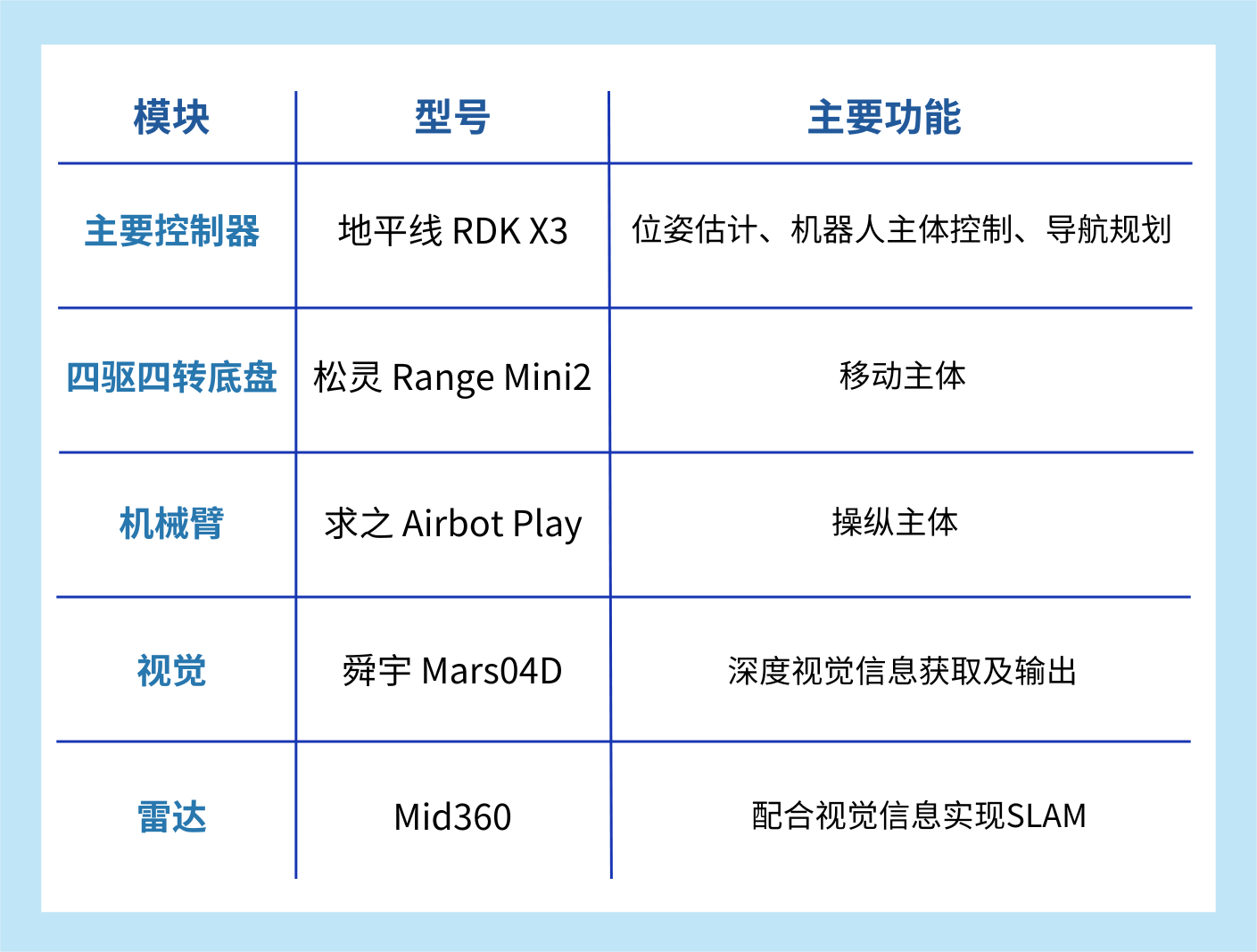 在下一阶段(Sim2Real阶段),参赛队伍需要在模拟器中进行算法开发与调试,并在规定日期内在线上提交代码,官方人员将对应代码部署于相同型号的实体机器人中测试其性能表现。比赛提供实体机器人具体硬件配置如下:
