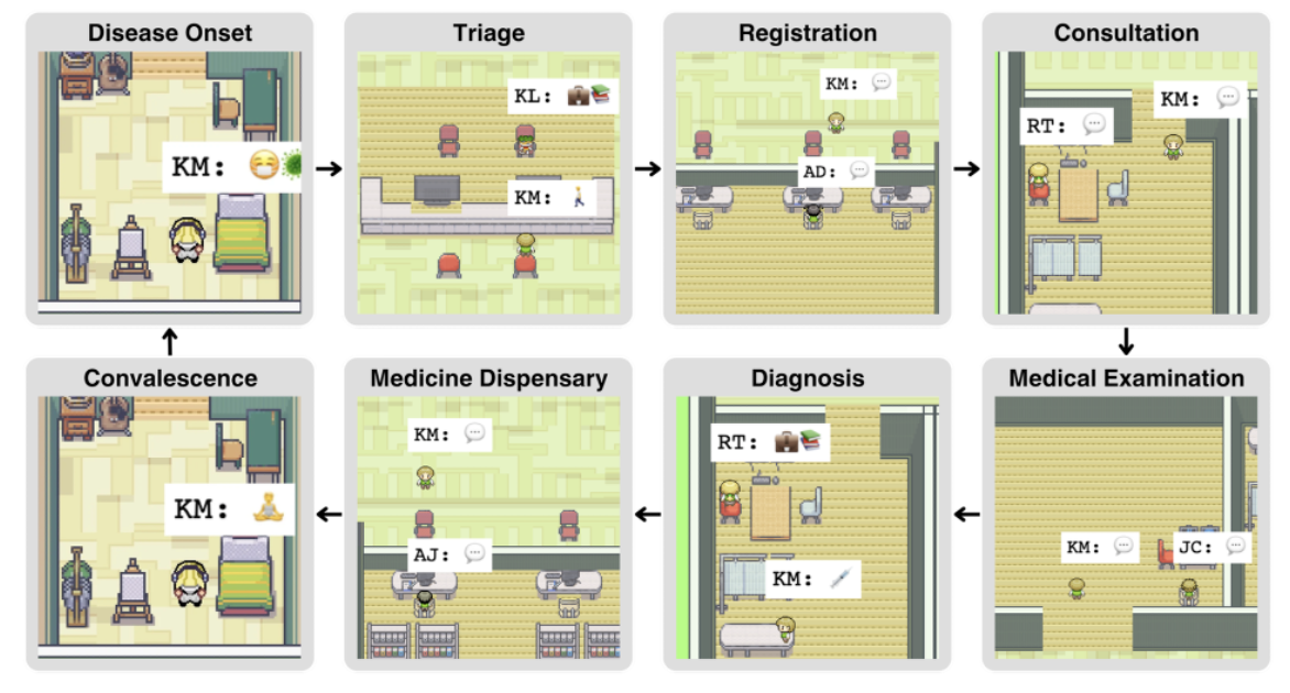 上图展示了闭环的诊疗环节:当病人智能体角色Kenneth Morgan患病后,他会前往医院求助。分诊护士Katherine Li了解Morgan的症状进行分析后,将他分诊到具体科室就诊。Morgan会根据医嘱完成挂号、咨询、医学检查后,医生Robert会给他最终的诊断和治疗方案,Morgan将会根据医嘱回家休息并反馈给医院康复情况,直至下次生病再前往医院。