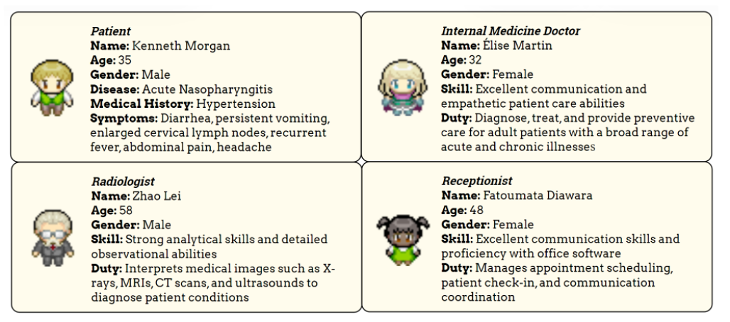 从上述示例中可以看到,研究团队为医院主要设计了两类角色:医护人员和患者。所有的角色信息都是由大模型(GPT-3.5)生成,因而可以很轻松地扩展增加。部分角色的具体信息如下图所示,35岁的患者Kenneth Morgan当前患有急性鼻炎,且有高血压病史,当前有持续呕吐等一系列症状;Zhao Lei则是一名经验丰富的影像科医生,内科医生Elise Martin具备优秀的交流能力,擅长内科急/慢性疾病的诊断、治疗。这些完整的人物信息背景提升了医院模拟的真实性。