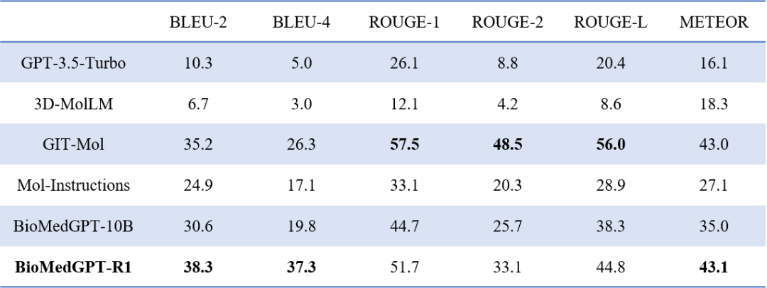 AIR和水木分子研究团队长期持续维护OpenBioMed开源平台(//github.com/PharMolix/OpenBioMed),团队现阶段探索方向是如何在强推理语言模型的基础上更好地适应性地实现跨模态对齐,团队正在以BioMedGPT-R1为基础进行系统性研究与综合评估,目前已经观察到其在化学分子理解任务上的性能提升,如在CheBI-20化学分子描述任务上相比上一版本效果提升超15%(表1),后续也将依托OpenBioMed平台开源BioMedGPT-R1模型和生物医药研发Agent系统框架。
