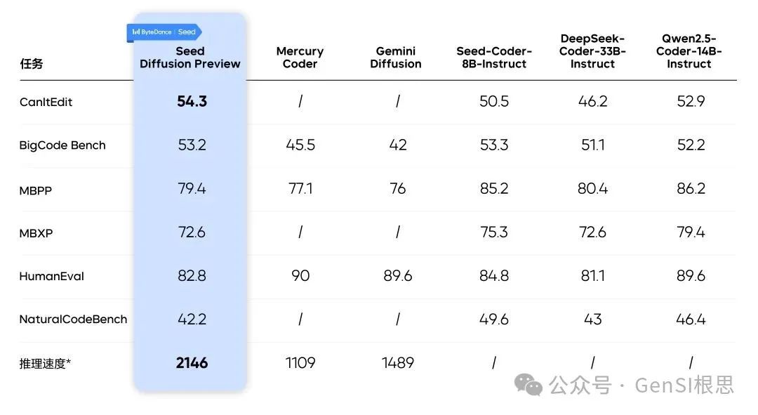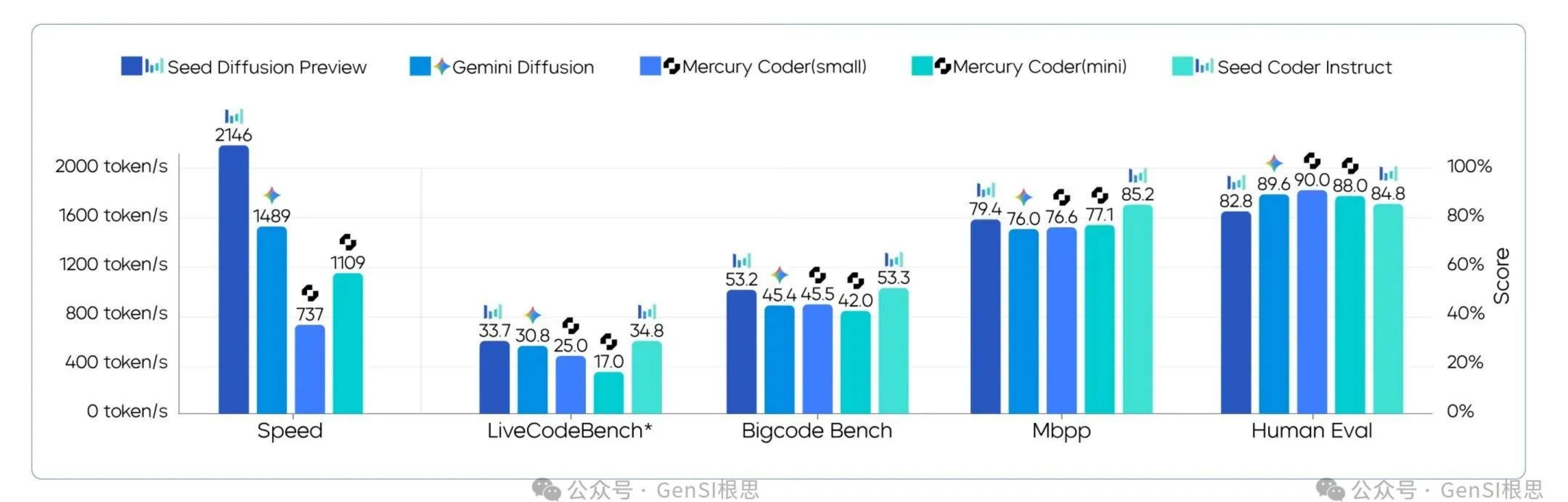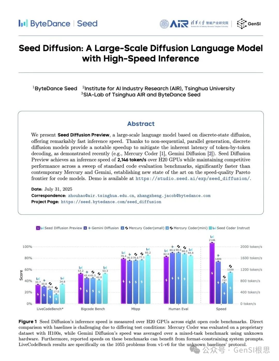 (AIR)与字节跳动Seed联合SIA-Lab发布了一项新的研究成果:基于扩散的超大规模语言模型 Seed Diffusion Preview,每秒钟生成2000+的词,超过了Google Gemini Diffusion,相较于纯自回归模型有巨大的速度和成本优势,这将很有可能会改变语言模型的范式,成为未来的主流。