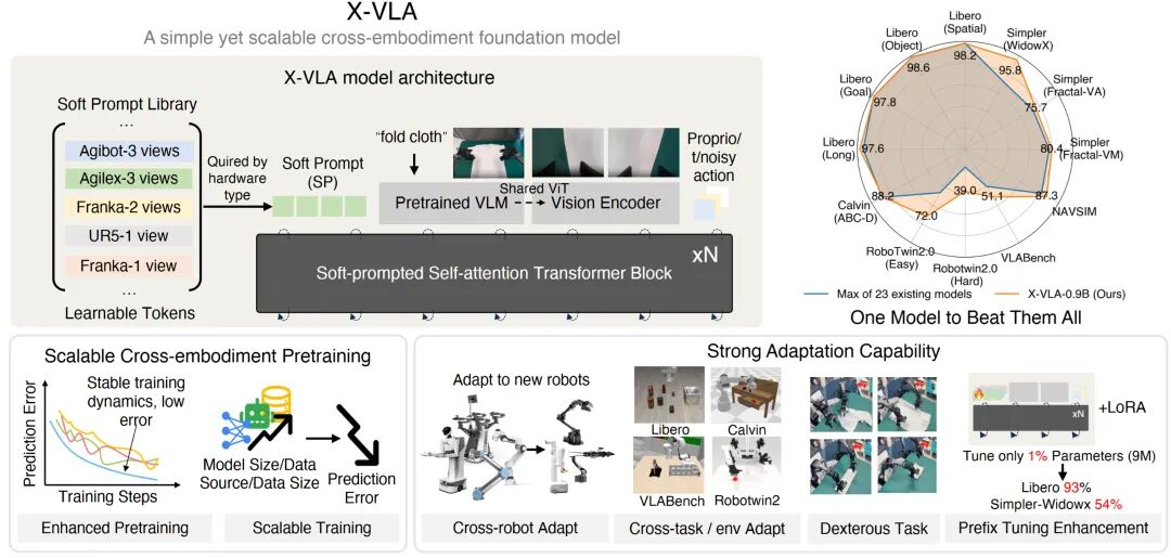 (AIR)与上海人工智能实验室联合发布全新通用跨本体具身基座模型:X-VLA。X-VLA是首个实现120min无辅助自主叠衣任务的全开源模型(公开数据、代码与参数),以仅0.9B的参数量在五大权威仿真基准上全面刷新性能纪录,为具身智能领域提供了一个性能强劲、完全开源的新基线与技术范式。