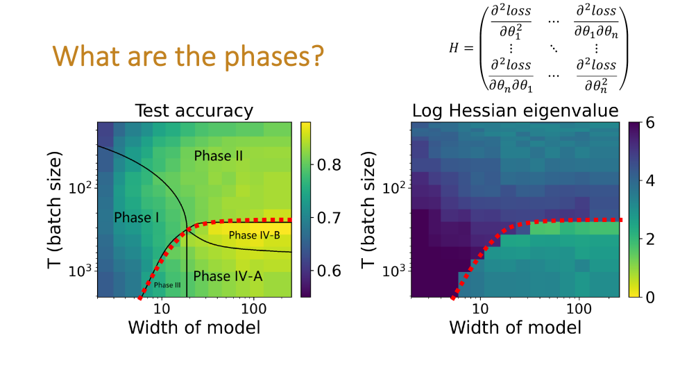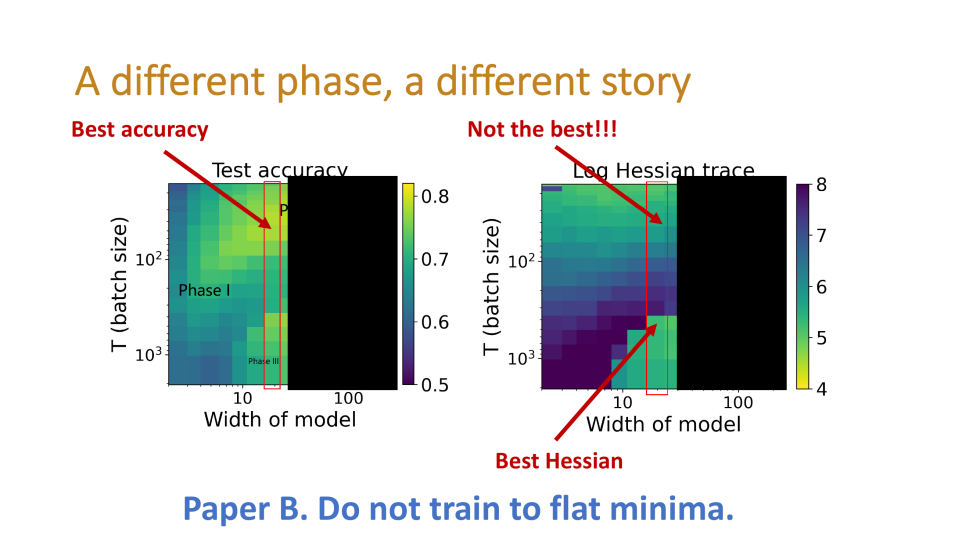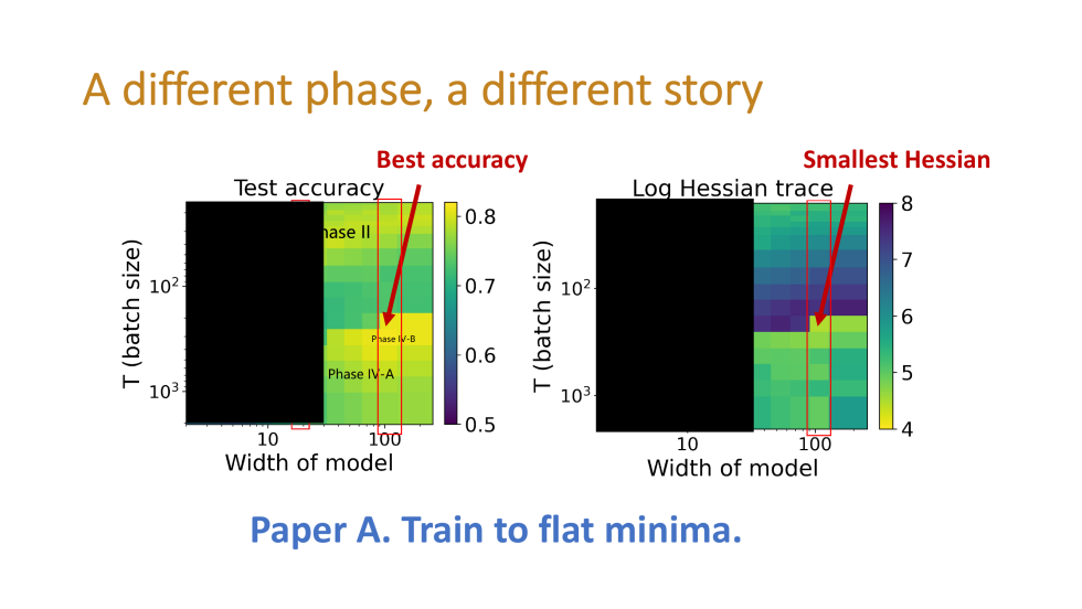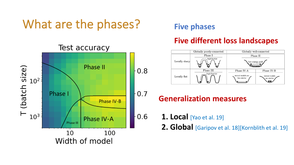 杨耀青博士及其团队在 NeurIPS2021 的一篇工作“Taxonomizing local versus global structure in neural network loss landscapes”中指出,损失函数形态与模型泛化性之间呈现的关系与模型训练超参所处的 ”相” (Phase)有关,而“相”对应的模型性能则可以通过 ”相图” 来刻画。相图的横轴对应于模型的 ”尺寸”,可以是隐藏层的大小、训练数据的数量或质量等;而纵轴则对应于训练的”温度”,表示模型在训练过程中的噪声程度,可以是 batch 的大小、学习率等。而图中的色温则代表模型的性能,如准确率。这种关于相图的研究在机器学习的统计物理方法(statistical mechanics of machine learning)中有着广泛应用。