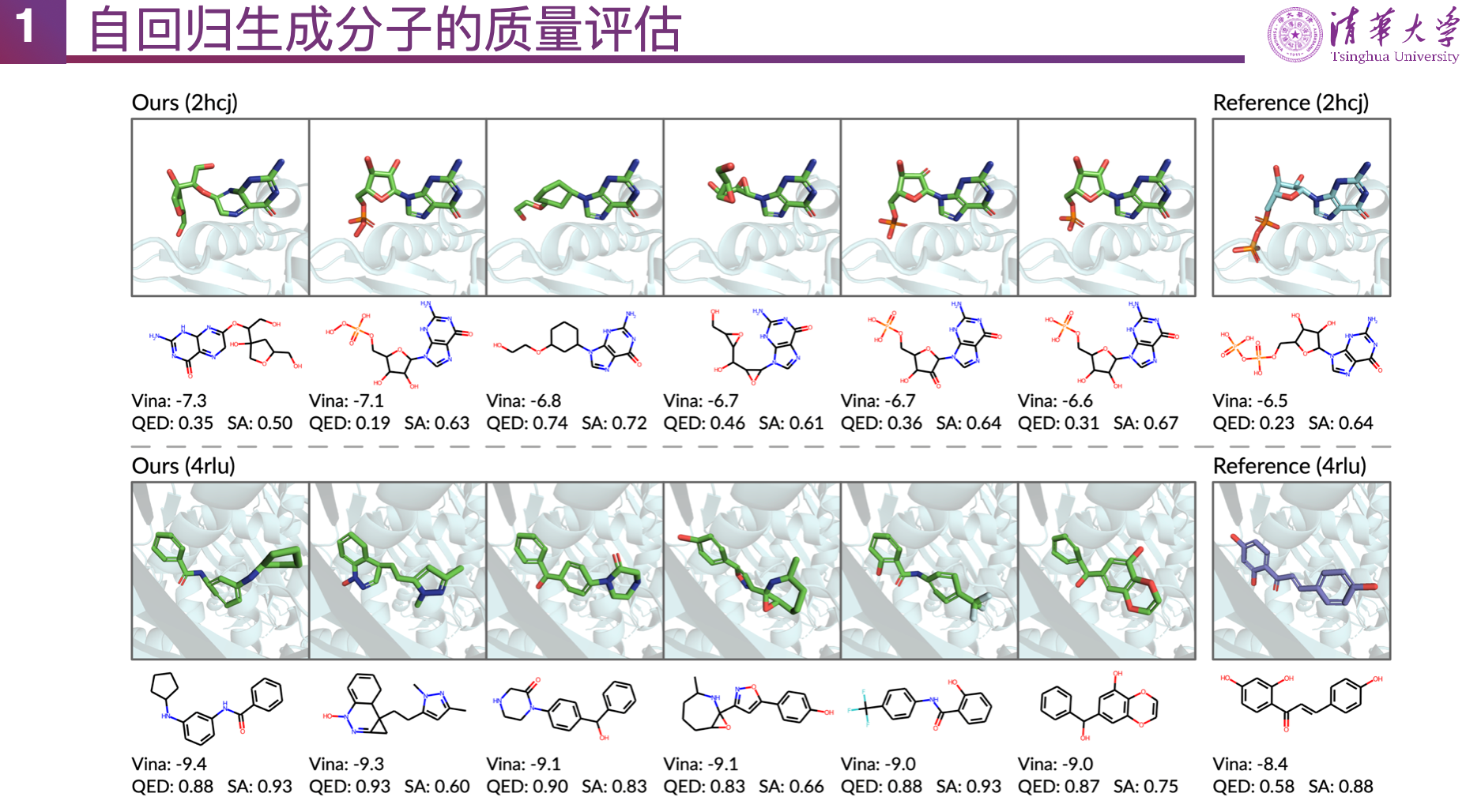 随后,马剑竹教授介绍了第一类方案,自回归生成小分子。一种方法是建模口袋内部原子密度,受到掩码语言模型(Masked Language Model)的启发,训练小分子生成模型 AR 时通过在口袋内随机遮蔽一些原子,在口袋内划分网格,预测每个格点出现某种原子的概率;生成时需要采样很多格点,再通过马尔可夫链蒙特卡洛方法(MCMC)将采样到的各格点原子概率逐个转化为原子位置和坐标,最后得到小分子。AR 模型能生成合理的结果,使用经典的分子对接软件 Vina 对结合能打分,平均在 -6.344 kcal/mol 左右,在类药性(QED)、可合成性(SA)等指标上也与训练数据分布相近。但这一模型的问题在于,打格点方式的采样效率很低。为此,马教授团队又提出了 Pocket2Mol 模型,用单独的神经网络预测中心原子(focal atom),据此进行下一个原子的位置预测,避免了网格式采样,用混合高斯提升了采样效率;此外还在逐原子的自回归生成的基础上又加入了单独的神经网络生成化学键,分子质量相比 AR 明显提升。