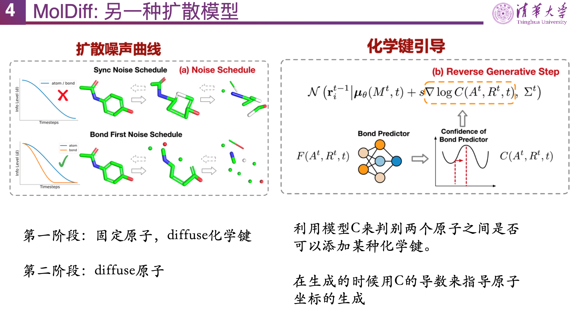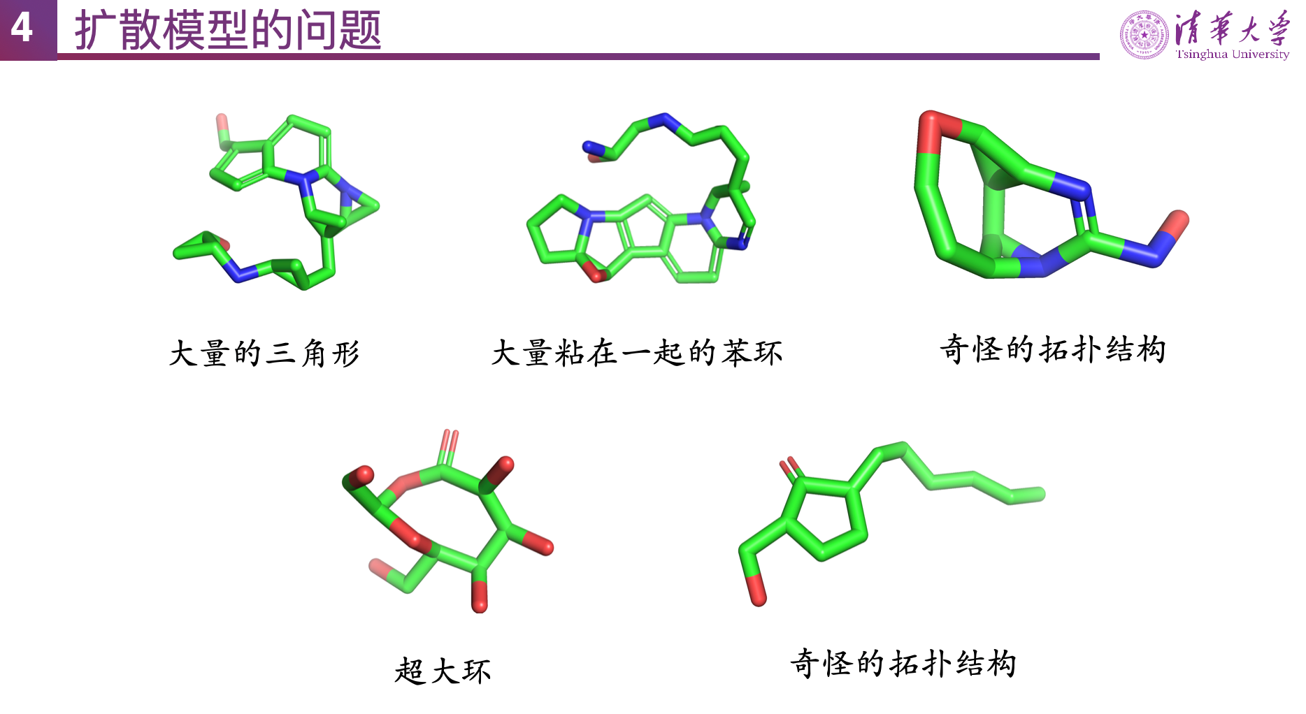 然而,Pocket2Mol 仍然存在一些问题,例如第一个原子坐标容易预测错误、生成的分子倾向于填满口袋内整个空间、难以预测何时停止等,这是由自回归的生成方式造成的。因此,马剑竹教授团队进一步探索了第二类方案,基于扩散模型的非自回归小分子生成模型。TargetDiff 所有原子一起生成,每个时刻都有全局信息,这样生成的分子键长和键角更符合训练数据。得益于扩散模型的高效训练,模型除了生成分子之外,对分子的似然还可以被用于结合能预测,相关系数可达 0.4-0.5。但是,由于 TargetDiff 仅在原子类型和坐标上进行扩散,通过 OpenBabel 后处理添加化学键,生成的分子构象仍然不够合理,有的分子存在三元环、并环、超大环以及其他可能扭曲的结构问题。