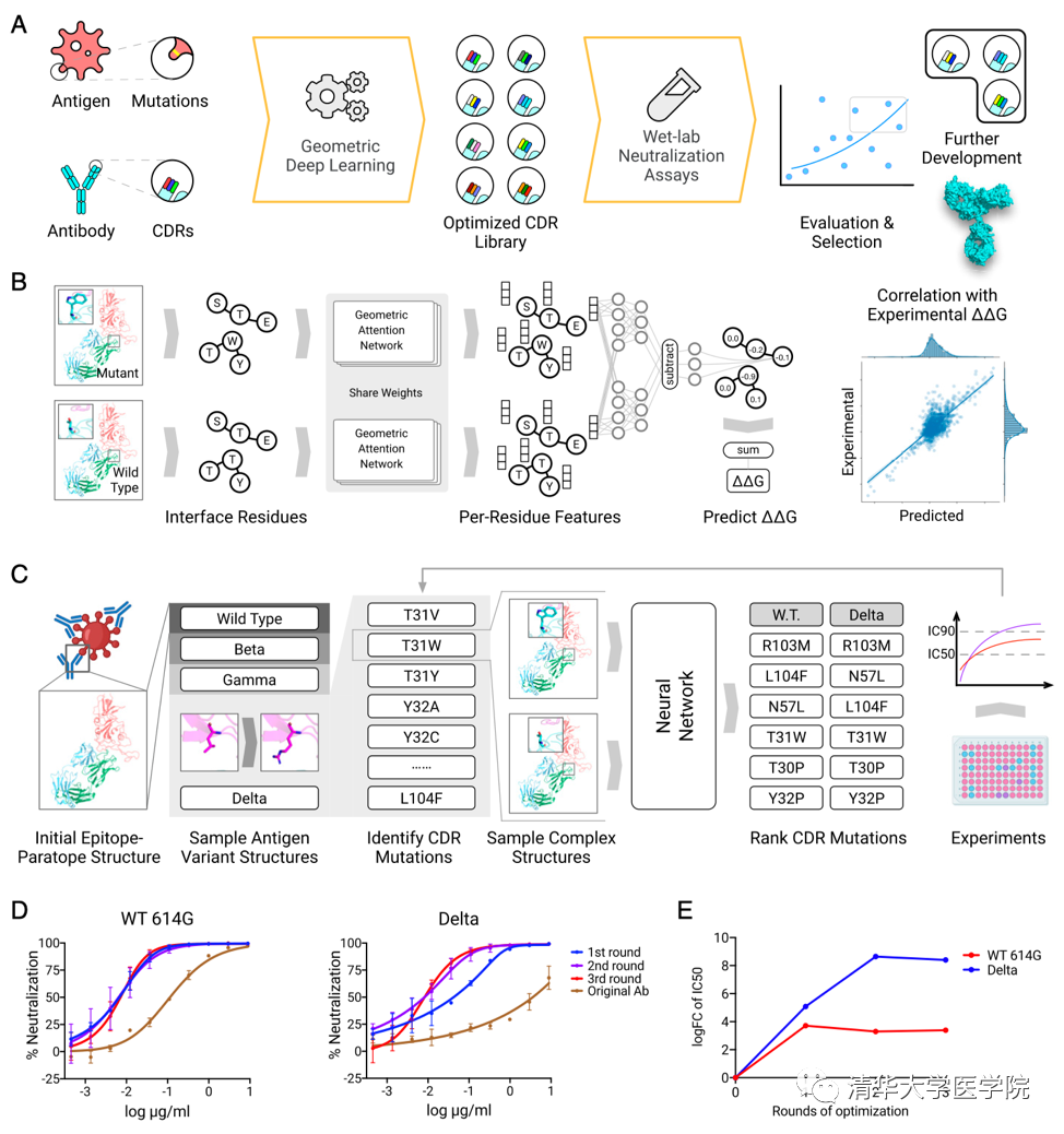 研究团队通过综合分析抗体与新冠病毒刺突蛋白在原子水平的相互作用,结合深度学习模型,完成了从抗体AI优化设计、抗体合成、功能评估和再优化的闭环程序(图1. A)。基于大量抗体-抗原复合物结构及结合亲和力数据,研究团队开发了一种基于注意力的几何神经网络架构,该模型可有效地提取残基间相互作用特征并预测由于抗体单个或多个氨基酸变化所引起的结合亲和力变化(图1. B)。研究团队对抗体的CDR区进行点突变,预测抗体突变后对新冠原始株及突变株的结合效果,获得具有高亲和力的抗体突变,并进行实验验证(图1. C)。与传统方法相比,深度学习具有更大的搜索空间,并且可同时针对不同新冠进行突变株抗体优化,由此理论上可获得更高效更广谱的中和抗体。